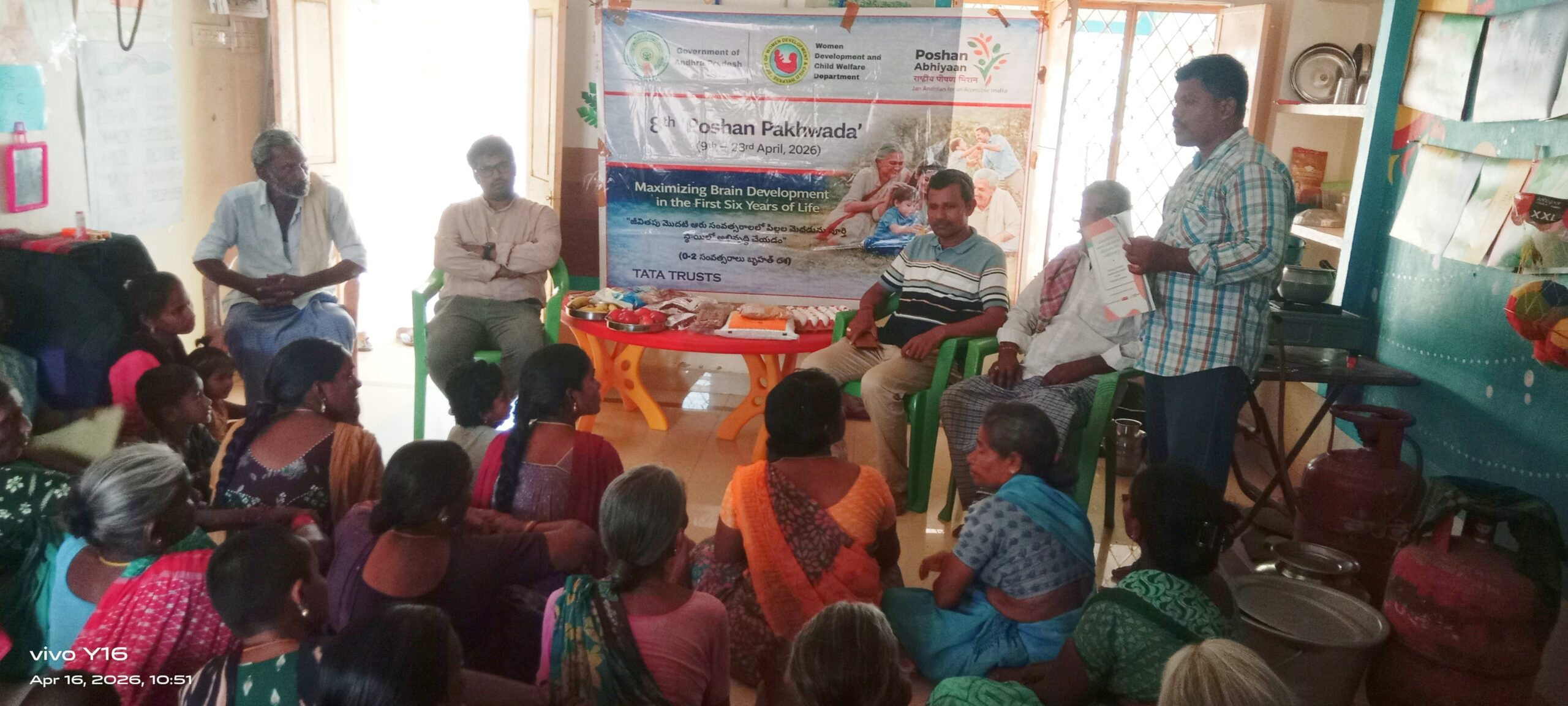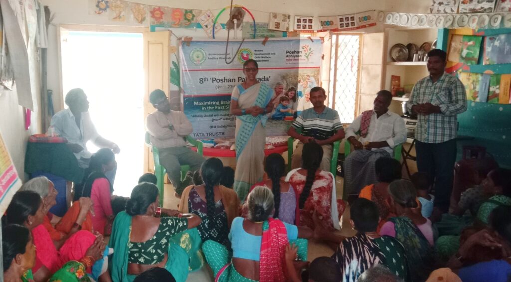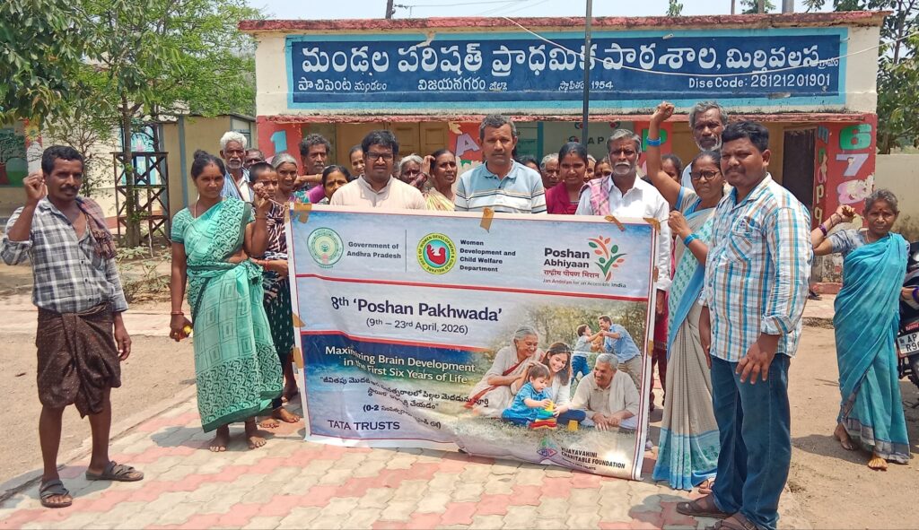 అంగన్వాడీ కేంద్రంలో 8వ పోషణ పక్వాడ కార్యక్రమం అంగన్వాడీ కేంద్రాల ద్వారా ప్రీ స్కూల్ పిల్లలు, గర్భిణీలకూ, బాలింతలకు పోషణ పక్వాడ పక్కాగా అమలు చేయాలని ఐసీడీస్ & TATA ట్రస్ట్ సమక్షంలో 8వ పోషణ పక్వాడ మిర్తివలస అంగన్వాడీ కేంద్రం పోషణ పక్షోత్సవాల కార్యక్రమంలో భాగంగా పాచిపెంట ఐ సి డి స్ & ప్రాజెక్ట్ టాటా ట్రస్ట్ ప్రోగ్రాం అసోసియేట్ ఎం. విజయ్ కుమార్ ఆధ్వర్యంలో ఇస్తున్న శిక్షణలో సమతుల ఆహారంపై, పిల్లలు మెదడు అభివృద్ధి, వ్యక్తిగత పరిశుభ్రత, పారిశుధ్యం,గురించి అవగాహన కల్పించటం జరిగింది.ఈ కార్యక్రమానికి మిర్తి వలస గ్రామ పంచాయతీ సర్పంచ్ ప్రతినిధి కే. పోలీనాయుడు, సెక్రటరీ, పి. దుర్గారావు, గ్రామపెద్దలు జీ. సత్యనారాయణ జి. శ్రీరాములు,అంగన్వాడీ కార్యకర్త, ఆయా,బాలింతలు, ప్రీ స్కూల్ తల్లులు,డ్వాక్రా మహిళల సంఘ సభ్యులు పాల్గొన్నారు Spread the love టపా నావిగేషన్ Ysrcp క్యాంపు కార్యాలయంలో ఘనంగా డాక్టర్ బి.ఆర్ అంబేద్కర్ జయంతి వేడుకలు