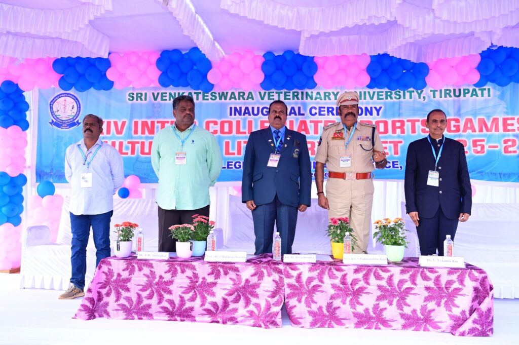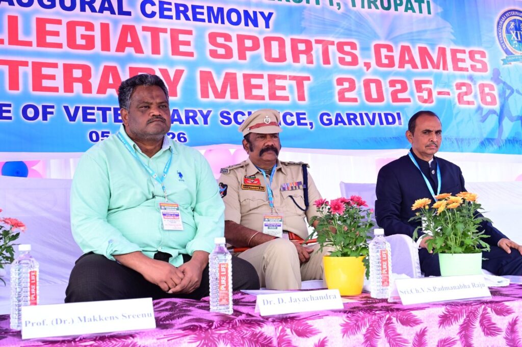 ముఖ్య అతిథిగా శ్రీ సి.హెచ్.వి.ఎస్. పద్మనాభ రాజు గారు, కమాండెంట్, ఏపీ స్పెషల్ పోలీస్, ఫస్ట్ బెటాలియన్, ఎచ్చెర్ల పాల్గొన్నారు. గౌరవ అతిథులుగా డాక్టర్ వి. వైకుంఠ రావు గారు (డీన్ ఆఫ్ స్టూడెంట్ అఫైర్స్, శ్రీ వెంకటేశ్వర వెటర్నరీ యూనివర్సిటీ, తిరుపతి), డాక్టర్ బి. జయచంద్ర గారు (ప్రొఫెసర్ & యూనివర్సిటీ హెడ్, ఫిజికల్ ఎడ్యుకేషన్), బాబురావు గారు (మయూర గ్రూప్స్ ఆఫ్ హోటల్స్, విజయనగరం), డాక్టర్ వై.ఆర్. అంబేద్కర్ గారు (ఆఫీసర్ ఆఫ్ స్టూడెంట్ అఫైర్స్) పాల్గొన్నారు. అతిథులు శాంతికపోతాలను ఎగురవేసి వేడుకలను ఘనంగా ప్రారంభించారు.