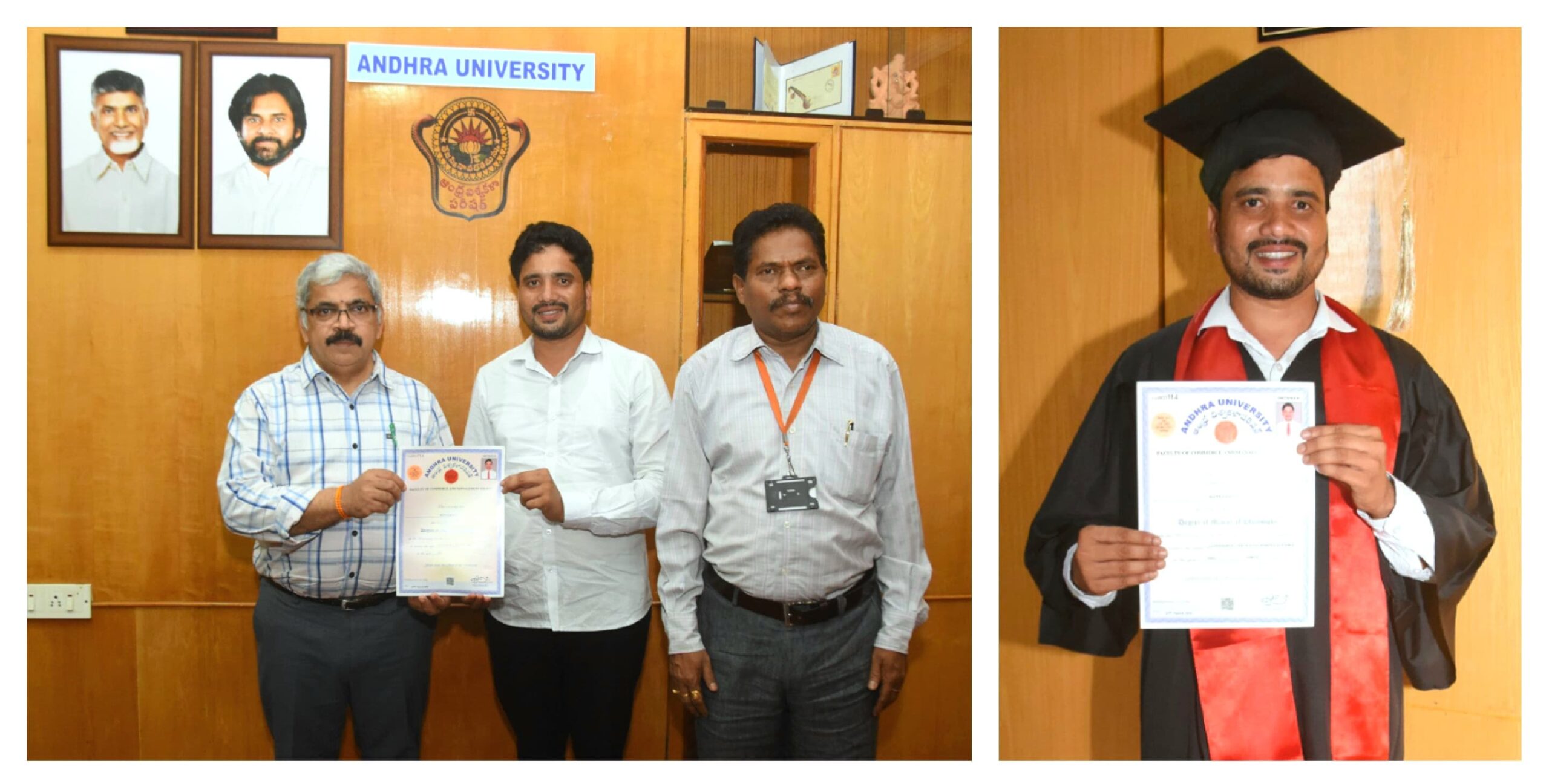 *ఆంధ్ర విశ్వవిద్యాలయం డిపార్ట్మెంట్ ఆఫ్ కామర్స్ అండ్ మేనేజ్మెంట్ స్టడీస్* నుంచి *మాస్టర్ ఆఫ్ ఫిలాసఫీ (ఎం.ఫిల్)* పూర్తి చేసి ఇటీవల ఏయు వేదికగా జరిగినా 91,92వ స్నాతకోత్సవంలో *ఆంధ్రప్రదేశ్ గవర్నర్ జస్టిస్ ఎస్. అబ్దుల్ నజీర్, ఆంధ్ర యూనివర్సిటీ వైస్ ఛాన్సలర్ ప్రొఫెసర్ జి.పి. రాజశేఖర్* చేతుల మీదుగా ఎం.ఫిల్ పట్టాను అందుకున్న *విజయనగరం జిల్లాకు చెందిన చీపురుపల్లి పట్టణవాసి కోట్ల కృష్ణ కు* పలువురు అభినందనలు తెలిపారు. డిపార్ట్మెంట్ ఆఫ్ కామర్స్ అండ్ మేనేజ్మెంట్ స్టడీస్ ఆచార్యుడు *డాక్టర్ కె.వి రమణమూర్తి* పర్యవేక్షణలో “*ఏ స్టడీ ఆన్ ఎన్ అప్రైజల్ ఆఫ్ హౌసింగ్ ఫైనాన్స్ స్కీమ్స్ విత్ రిఫరెన్స్ టు పబ్లిక్ అండ్ ప్రైవేట్ సెక్టార్ బ్యాంక్స్ ఇన్ విశాఖపట్నం డిస్ట్రిక్ట్ ఆంధ్ర ప్రదేశ్* ” అనే అంశంపై చేసిన పరిశోధనకు గాను ఆయనకు ఏయూ నుంచి ఈ ఎం.ఫిల్ పట్టాను అందజేసింది. ఈ సందర్భంగా  ప్రిన్సిపల్ ప్రొఫెసర్ జాలాది రవి, ఫ్యాకల్టీ ఆఫ్ కామర్స్ అండ్ మేనేజ్మెంట్ చైర్మన్ ప్రొఫెసర్ పి. అరుణ్ కుమార్, బోర్డ్ ఆఫ్ స్టడీస్ చైర్మన్ ప్రొఫెసర్ పి. వెంకటేశ్వర్లు, విభాగాధిపతి ప్రొఫెసర్ ఎం. ఉమాదేవి, ఆచార్యులతోపాటు, నాన్స్ టీచింగ్ స్టాఫ్ మరియు ఏయూ పరిశోధకులు అభినందించారు.