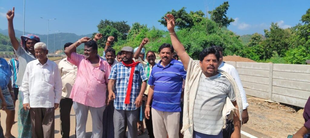 పంట పొలాలకు తోవలు కల్పించాలని. రైతులు రాకపోకలకు సర్వేస్ రోడ్డు వేయాలని వేసిన సైడ్ వాళ్ళను తొలగించాలని కోరుతూ రైతులు నేషనల్ హైవే సమీపంలో ఉన్న. రహదారి వద్ద నిరసన కార్యక్రమం చేపట్టారు. నిరసన కార్యక్రమంలో ముందుగా నౌలుగు నర్సింగరావు రాపాక అప్పారావు. సర్పంచ్ ఇజ్జడ అప్పలనాయుడు జడ్పిటిసి మాజీప్రతినిధి సలాది అప్పలనాయుడు ఆధ్వర్యంలో జరిగింది. ఈ కార్యక్రమాన్ని ఉద్దేశించి రైతు సంఘం జిల్లా అధ్యక్షులు ఎం కృష్ణమూర్తి గారు మాట్లాడుతూ. నేషనల్ హైవే అధికారులు. చిన్న చిన్న నిబంధనలకు ఉల్లంఘించి ఇష్టారాజ్యంగా సైడ్ వాళ్ల నిర్మాణం చేపట్టే రైతులను పంట పొలాలకు వెళ్ళనీయకుండా తోవలు లేకుండా చేయడం దుర్మార్గమని. ఇప్పటికైనా పంట పొలాలకు ఎటువంటి ఇబ్బందులు లేకుండా వేసిన సైడ్ వాళ్ళను తొలగించి సర్వీస్ రోడ్ వెయ్యాలని వారం రోజుల్లో సమస్య పరిష్కారం చేయకపోతే ఆందోళన కార్యక్రమాలు తీవ్రతరం చేస్తామని హెచ్చరించారు. కేంద్ర రాష్ట్ర ప్రభుత్వాలు ఆదాని సేవలో మునిగిపోయి రైతులు సమస్యలు విస్మరించాయని దాదాపు హైవే పక్కన ఉన్నటువంటి రైతులందరూ కూడా తీవ్రమైన కష్టాలు ఎదుర్కొంటున్నారని ఇటువంటి పరిస్థితుల్లో దేశానికి అన్నం పెట్టే రైతును అన్ని విధాల ఆదుకునే విధంగా పాలకులు చర్యలు తీసుకోవాలని కోరారు సమస్త పరిష్కారం కోసం పోరాటం తప్ప మరో మార్గం లేదని రైతులంతా సంఘటనంగా ఉద్యమించాలని పిలుపునిచ్చారు. ఈ కార్యక్రమంలో. రైతు ప్రతినిధులు ఇజ్జాడ శ్రీనివాసరావు సలాది నరసింహులు. మరియు రైతులతో పాటు సిఐటియు నాయకులు కోరాడ ఈశ్వరరావు పాల్గొన్నారు