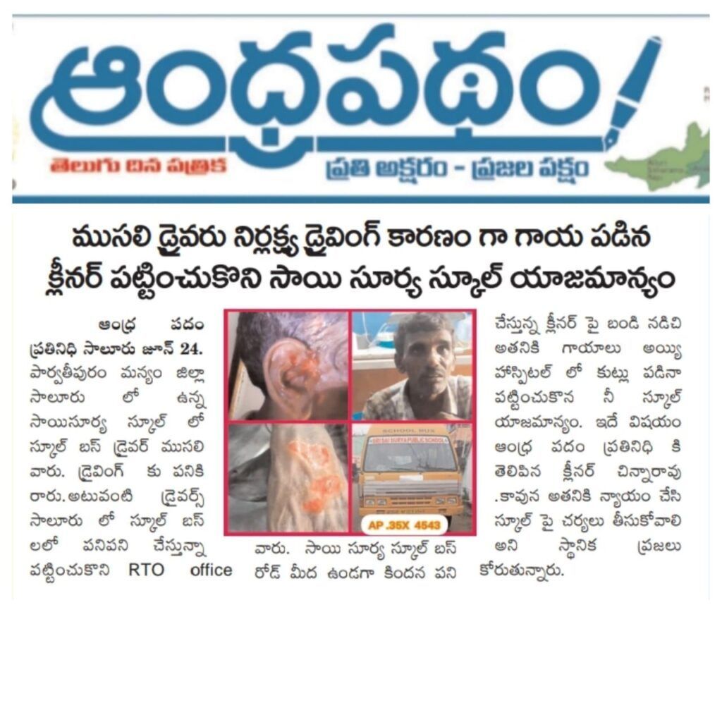 పార్వతీపురం మన్యం జిల్లా సాలూరు పట్టణం లో అవాస్తవ సంఘటనలు వాస్తవాలుగా చిత్రీకరించి సామాజిక మాధ్యమాల్లో(సంతోషం టీవీ) ప్రచురించి ప్రజలను తప్పు త్రోవ పట్టించే ప్రయత్నంలో నిమగ్నమైన ఒక వ్యక్తి. నిన్న సాయంత్రం మక్కువ బైపాస్ రోడ్ లో స్కూల్ బస్సు మరమ్మత్తు చేస్తున్న సమయంలో ప్రమాదవశాత్తు క్లీనర్ కు స్వల్ప గాయాలయ్యాయి. ఇది తెలుసుకున్న స్కూల్ యాజమాన్యం బాధితున్ని ఆసుపత్రికి తరలించి వైద్యం అందించడం జరిగింది. ఈ విషయాన్ని గమనించి ఒక వ్యక్తి సంబంధిత స్కూల్ పై మరియు యాజమాన్యంపై దుష్ప్రచారం చేస్తూ సామాజిక మాధ్యమాల్లో (సంతోషం టీవీ) మరియు (ఆంధ్రపథం పత్రిక ? ) బాధితుడు యొక్క మాటలను తప్పుగా వక్రీకరించి ప్రచురించడం జరిగింది. ఈ సంఘటన జరిగి 12 గంటల తరువాత తప్పుగా చూపించటానికి గల కారణం స్కూల్ యాజమాన్యం సదరు వ్యక్తి చేసిన డిమాండ్ ను ఒప్పుకోక పోవటం వల్లనేనని గుసగుసలు వినిపిస్తున్నాయి